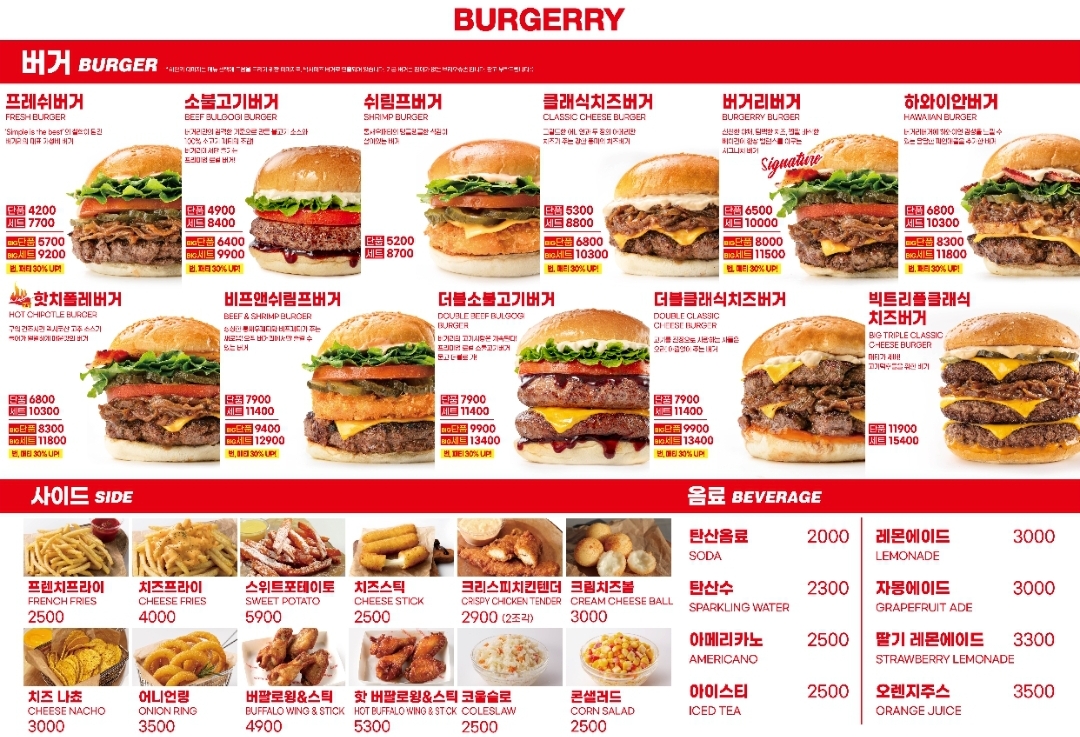 나는 버거리 시그니처버거 세트를 먹었는데 수제버거 세트가 만원이었다. 요즘 수제버거 세트 아니어도 버거에 음료만으로도 2만 원인데 상당히 흡족한 가격이었다. 기본 버거 메뉴는 더 저렴하다.