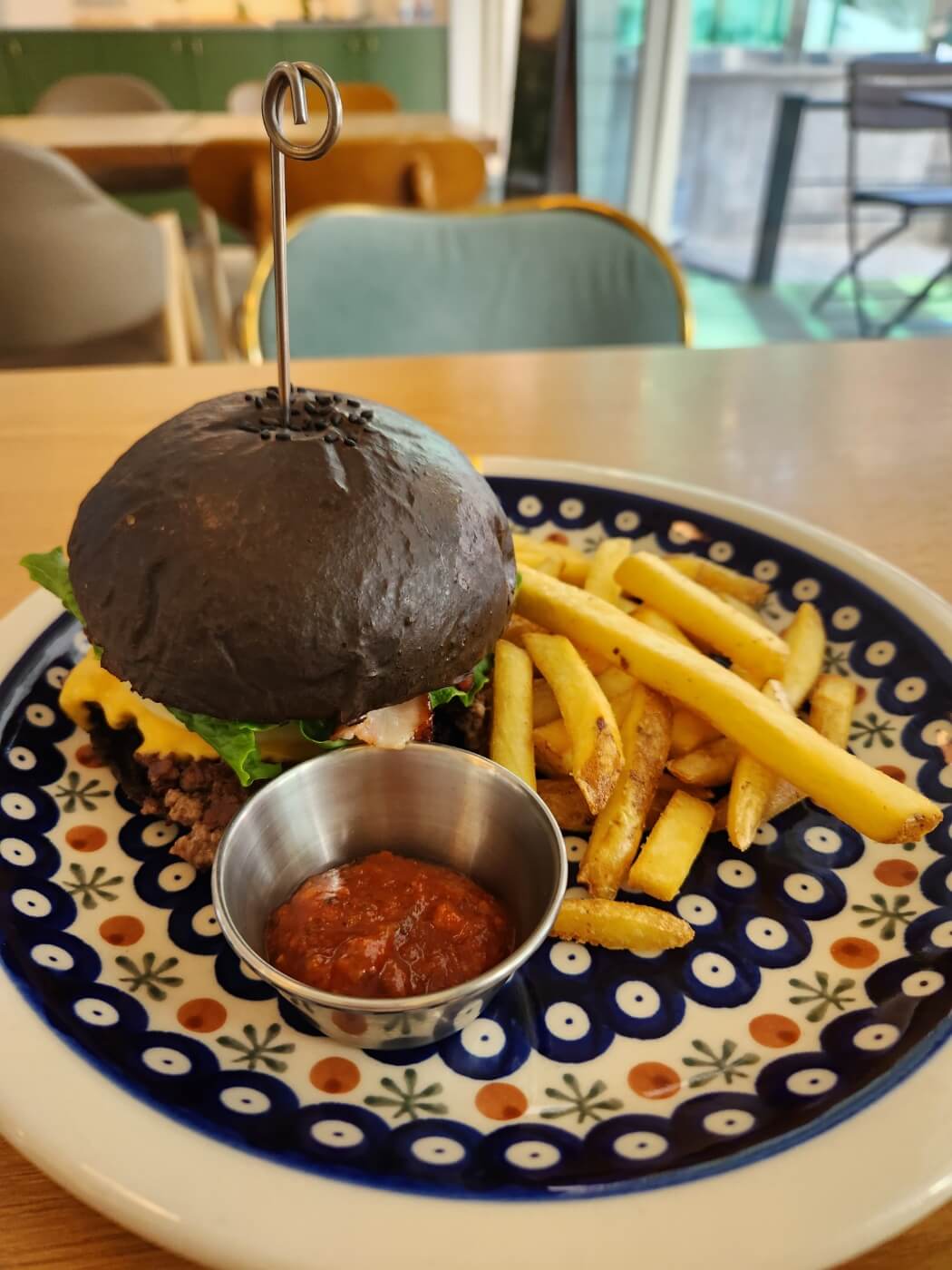 무엇때문인지 끝으로 갈수록 매운 맛이 느껴졌어요. 감튀에 케찹말고 향이 꽤 강한 소스를 따로 주는데 케찹보다는 나았고 그렇다고 너무 훌륭한 맛의 소스는 아니었어요. 빵을 선택할 수 있어요. 저는 먹물을 선택했는데 마치 공갈빵처럼 누르면 수욱 들어가면서 부드러웠습니다.