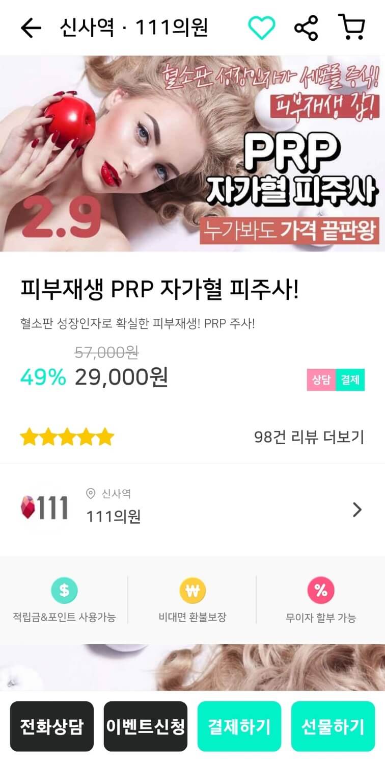 저는 겨율이라 피부가 건조하고 잔주름도 조금씩 생기는 거 같아서 PRP 시술을 받고 왔어요. 여러 좋다는 스킨부스터 많이 맞아 봤지만 다들 비싸기만 하고 효과도 별로 없었는데 PRP 재생 주사는 정말 가성비가 훌륭하더라구요. 받고 나면 피부에 윤기가 돌고 화이트닝 효과도 탁월해요. 그래서 PRP를 좀 제대로 놔주는 가격 착한 병원을 찾다가 미인하이에서 111의원을 발견하게 되었어요. 111의원에서 PRP시술을 가장 저렴하게 받는 방법을 알려드릴게요.