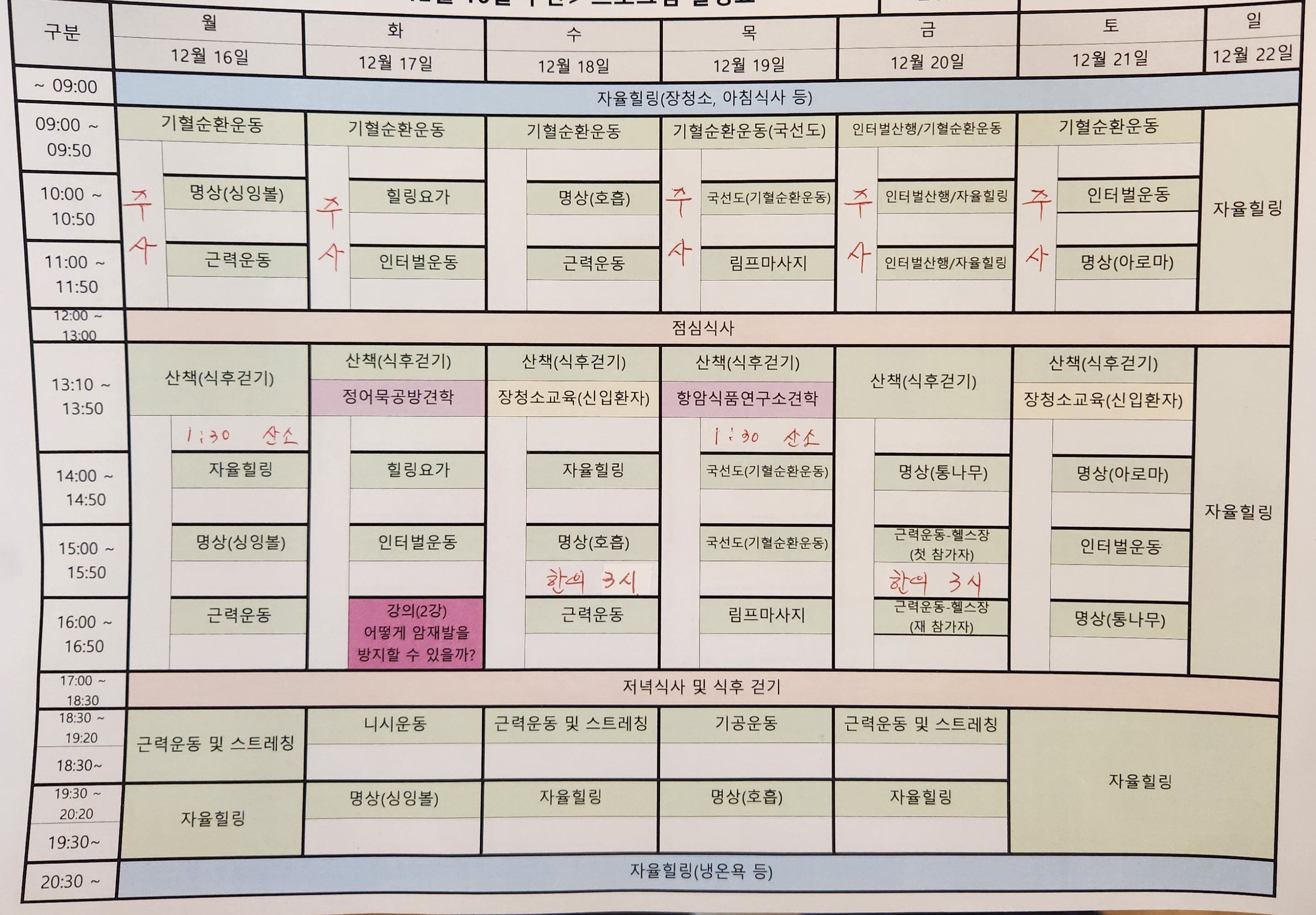 자연드림 힐링파크 안에 운영하는 스포츠센터를 모두 무료로 이용할 수 있다. 아이쿱은 또하나의 재발방지 건강비법으로 운동과 냉온욕을 강조하는데 그걸 꾸준히 할 수 있는 운동 프로그램과 시설을 잘 갖추고 있다. 여러 프로그램 중에 명상 프로그램과 아로마 오일 프로그램도 심신안정에 아주 큰 도움이 되었다.