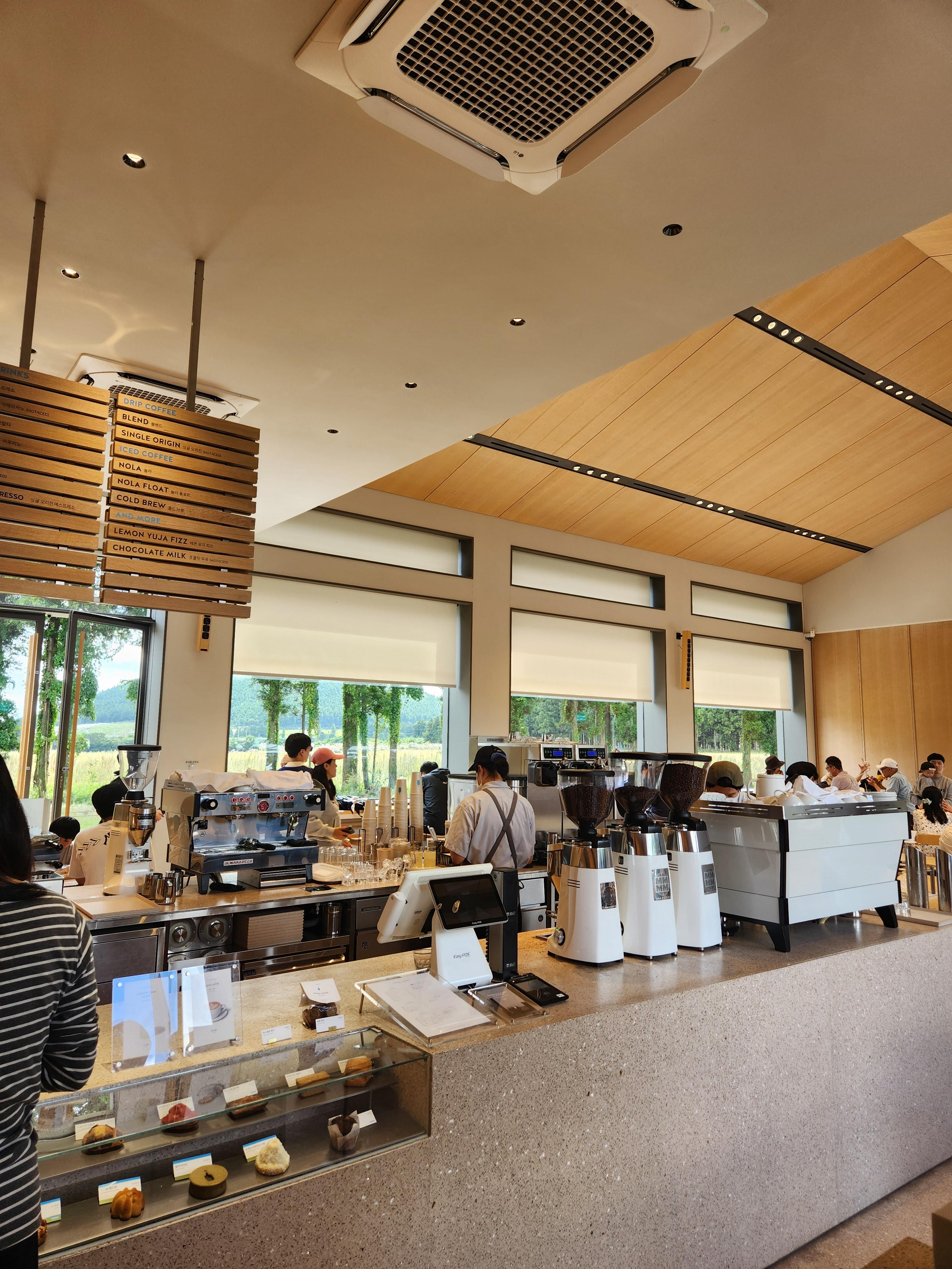 카페 밖 주변이 온통 푸르른 벌판에 나무가 있는 풍경이라  너무 인상적이고 좋았다. 파란 하늘과 어우러진 푸른 벌판을 바라보며 커피를 마시니 저절로 힐링이 되었다. 사람이 워낙 많아서 자리 잡기가 어려웠는데 나무 때문에 자연 형성된 그늘이 있어서 개인돗자리 깔고 잔디밭에 앉아 있어도 될 거 같다.