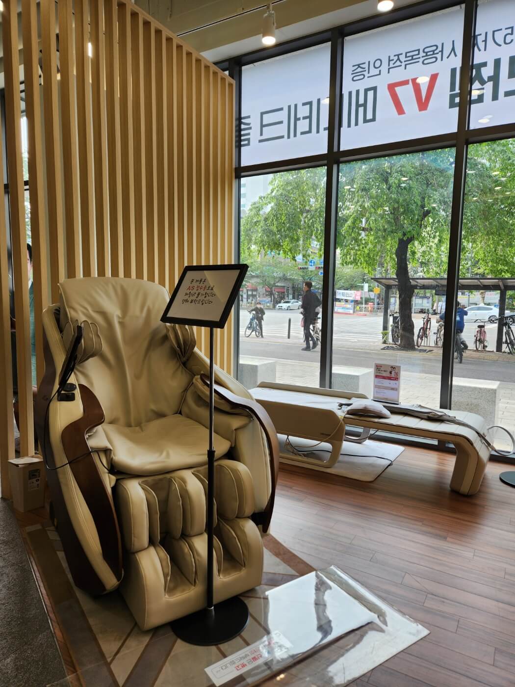 까페에 들어가면 체험가능한 안마기가 전시되어 있고 음료를 마실 수 있는 테이블이 여러 개 놓여있다.