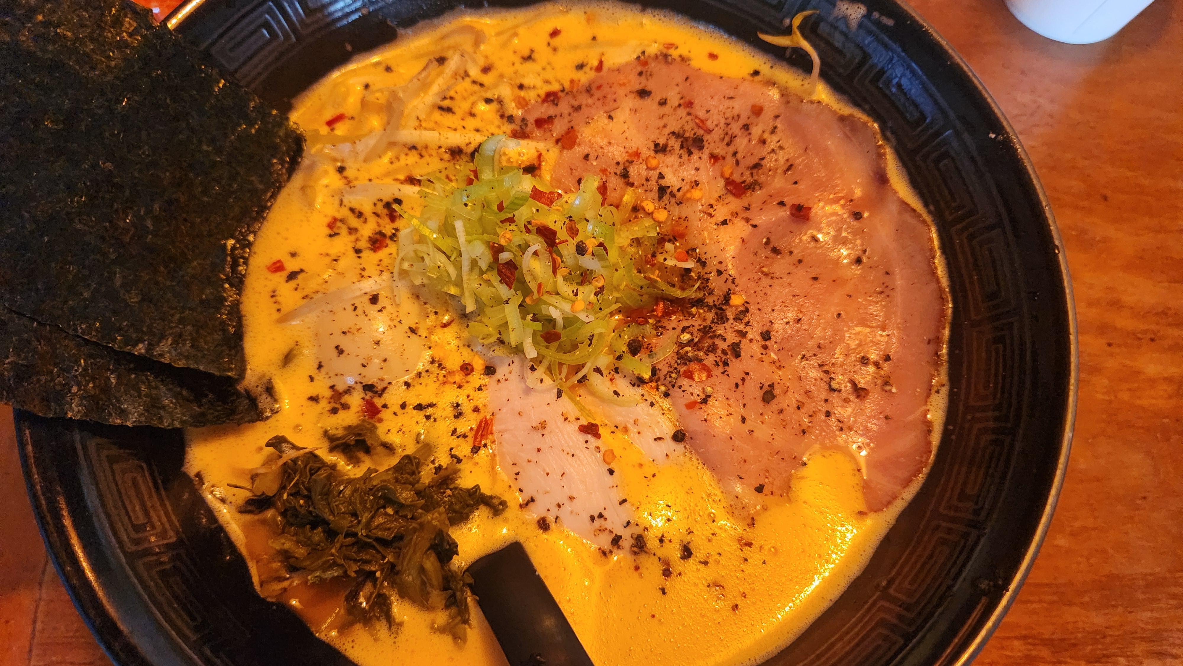 라멘 국물이 닭과 돼지 육수를 혼합했다고 하던데 상당히 걸쭉해서 놀랐다. 걸쭉해서 그런지 살짝 짠감이 있었다. 수비드 닭고기가 들어있는 게 좀 특이했다.