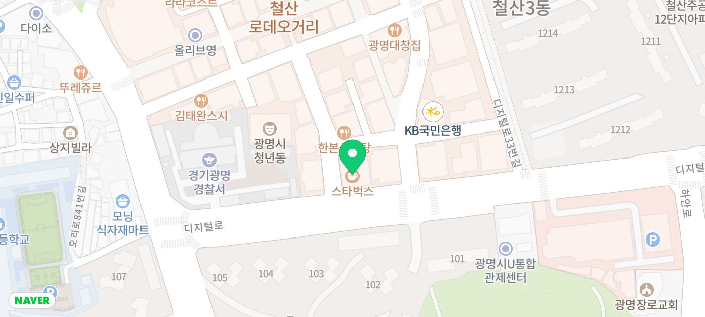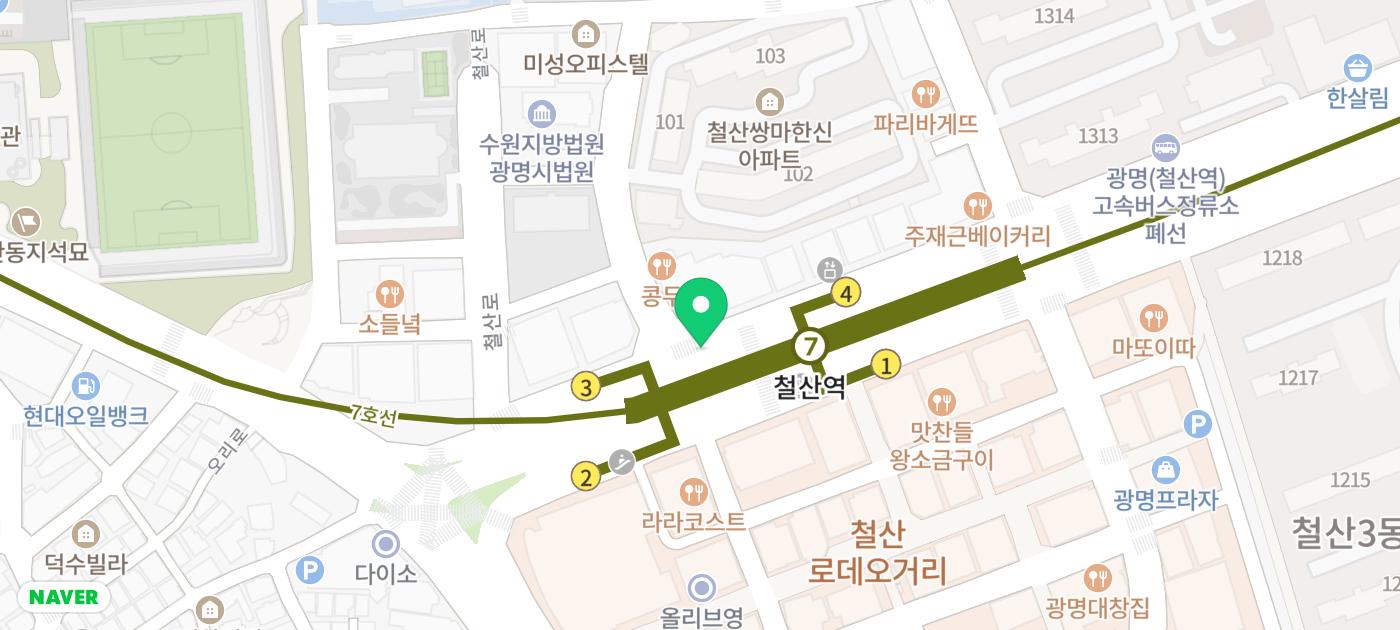철산 삼거리 바로 앞 다이소 건물 1층에 위치해 있다. 다이소 바로 옆이다. 위치상 접근성이 아주 좋다.