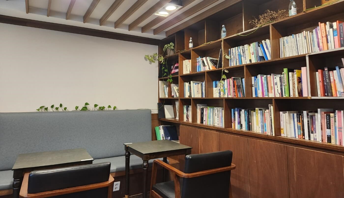 책을 들고 가서 읽어도 좋지만 한쪽 벽면에 책이 많이 비치되어 있어서 그냥 가서 골라 읽어도 좋을 거 같았어요.