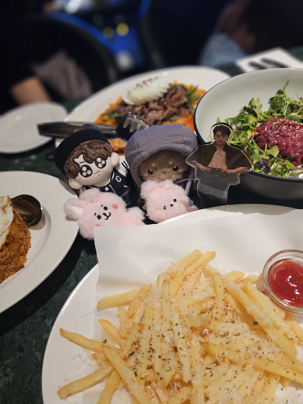 아미들이 주로 먹었다던 메뉴(떡볶이, 감자튀김, 김치볶음밥, 육회비빔밥 등) 위주로 시켰는데 맛은 모두 중상 정도는 되었지만 가격이 모두 2~3만원대로 메뉴에 비해 가격이 사악했다. 역시 살벌한 청담 물가~~~